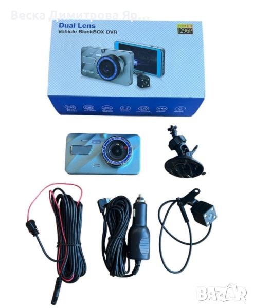 Видеорегистратор за автомобил; Тип камера: Единична с допълнителна задна камера; Основен сензор: Sony, резолюция 2K (1920 x 1080 пиксела); Ъгъл на виждане: 140 градуса; Видео компресия: H.264; Нощно виждане: Super Night Vision, F 1.6 лещи, алгоритъм за намаляване на шума; Цикличен запис: Да, с Micro SD карта до 64 GB (включена); G-сензор: Да, 3 нива на чувствителност; Монтаж: Предно стъкло, възможност за регулиране на камерата; WDR: Да; Задна камера: HD 720p (1080 x 720 пиксела), 6.5 метра кабел; Дисплей: 4-инчов IPS, тъчскрийн; Микрофон и високоговорител: Вградени; Видео формат: mp4; Захранване: 12-24V зарядно, USB 2.0; Батерия: Вградена 400mAh; Размери на основната камера: 25.5 x 7.5 x 2 см; Спецификация: CE, FCC, Po.