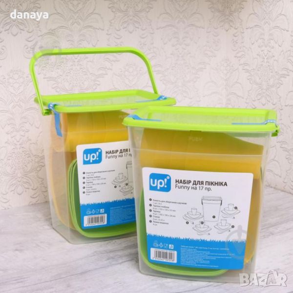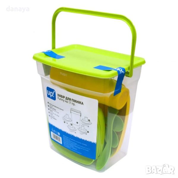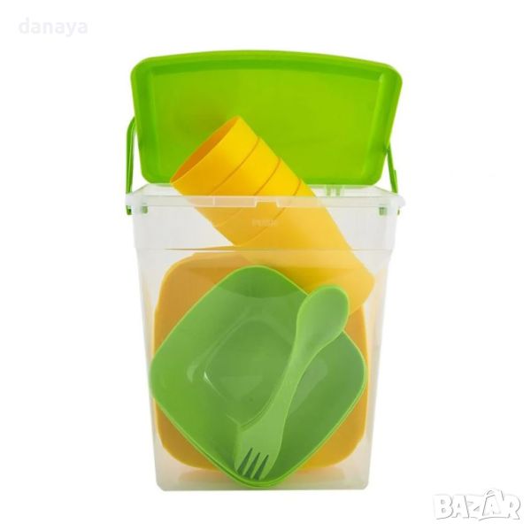 Комплект за пикник с пластмасови прибори и посуда поместени в 6 литрова кофа. Всичко, което ви трябва, като прибори, за един пикник е събрано в една кутия.