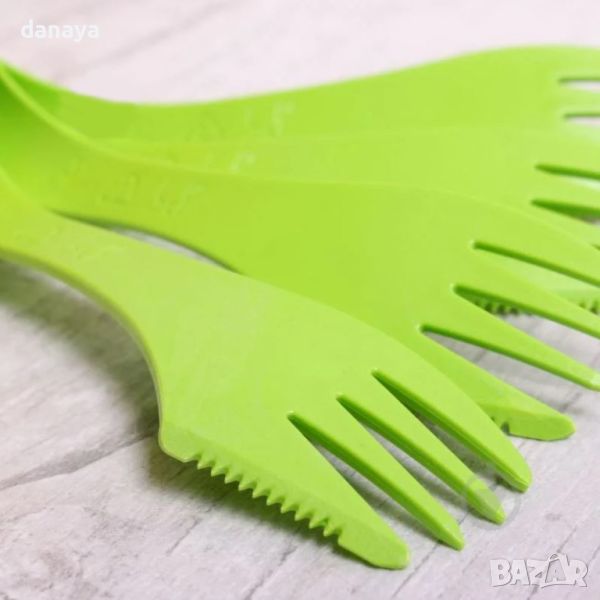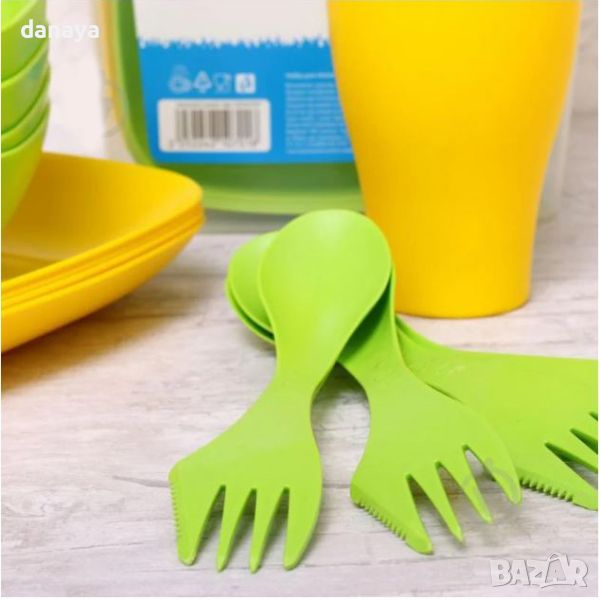 4 прибора, които от единия край са лъжици, от другия вилици и нож за рязане на плодове и зеленчуци (едната страна на вилицата е назъбена).
