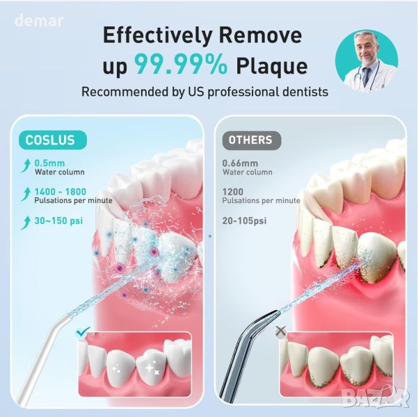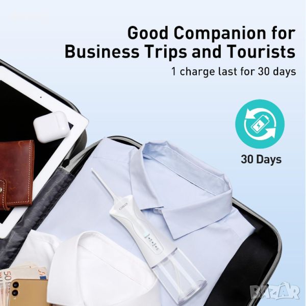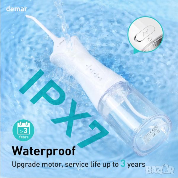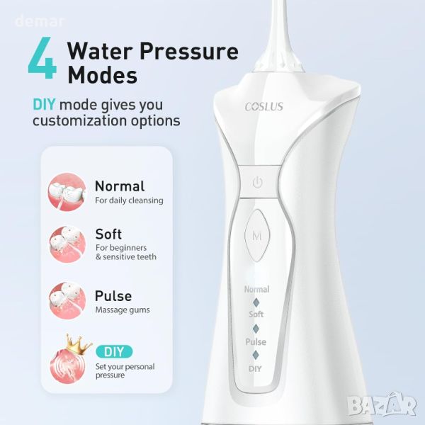 Този безкабелен иригатор разполага с 0,5 mm ултра фин воден стълб с 1400-1800 импулса в минута и водно налягане 30-150 PSI, ефективно премахва 99,9% от петната и освежава дъха. Той предлага 4 режима на почистване (Нормално, Меко, Импулсно, Направи си сам), за да отговаря на различни нужди и е IPX7 водоустойчив за безопасно използване под душа. Акумулаторната батерия издържа до 30 дни, а нейният компактен, ергономичен дизайн е идеален за пътуване. Подвижният резервоар за вода от 300 ml осигурява удобство с по-малко зареждания. С 4 струйни накрайника и въртяща се на 360° дюза, той е идеален за брекети и осигурява цялостно почистване. Издръжливият мотор предлага 3-годишен живот. Пакетът включва 1 иригатор, 4 резервни глави, ръководство за потребителя и кабел за зареждане (адаптер не е включен).