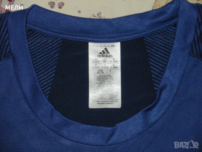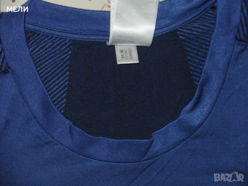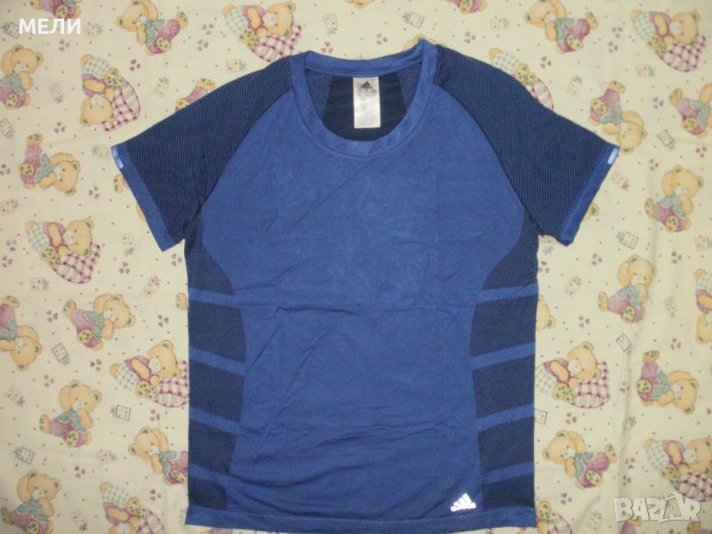 Тениската на ADIDAS, оригинална, обличана, без забележки като нова. По номер е XL но е слим и стои по тялото, става и за L. Материята е найлон, полиестер и еластан, много е лека, тънка, мека и еластична. Цветовете са като на снимките, много свежи. Без шевове е отстрани. Перфектна е за фитнес и други спортове. Сравнете мерките!!!