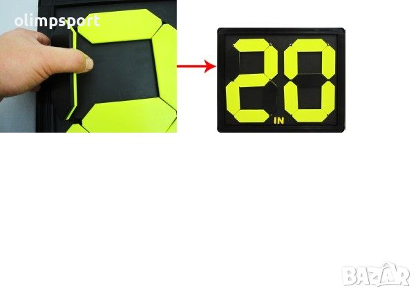 Табло за смени MAX с размери 43.5х37.5 см. Лесно и удобно за използване. От едната страна показва номер на играча, който напуска игра (в червен цвят), а от другата страна показва номер на играча, който влиза в игра (в електриково жълт цвят). Удобен механизъм за смяна на номерата чрез разделени на елементи цифри. Всеки елемент е закрепен с ластик. Промяната на номерата става чрез завъртане на даден елемент и показване на черната му част, която се слива с фона. Размери на таблото - 43.5х37.5 см. Тегло - 1.4 кг.
