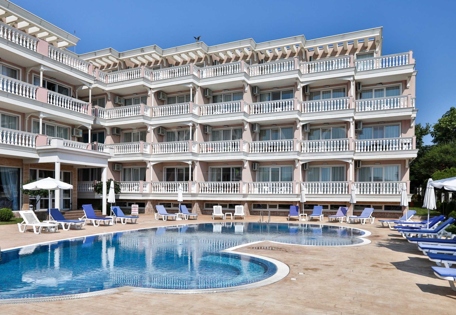 Сградата се откроява с изискана и елегантна архитектура, с просторни тераси с балюстри. Ориентирана е към морския бряг и предлага невероятни гледки към морето и плажа. Има всички необходими за приятната почивка удобства на територията: басейн, подземен паркинг и ресторант, охрана, видеонаблюдение и рецепция.