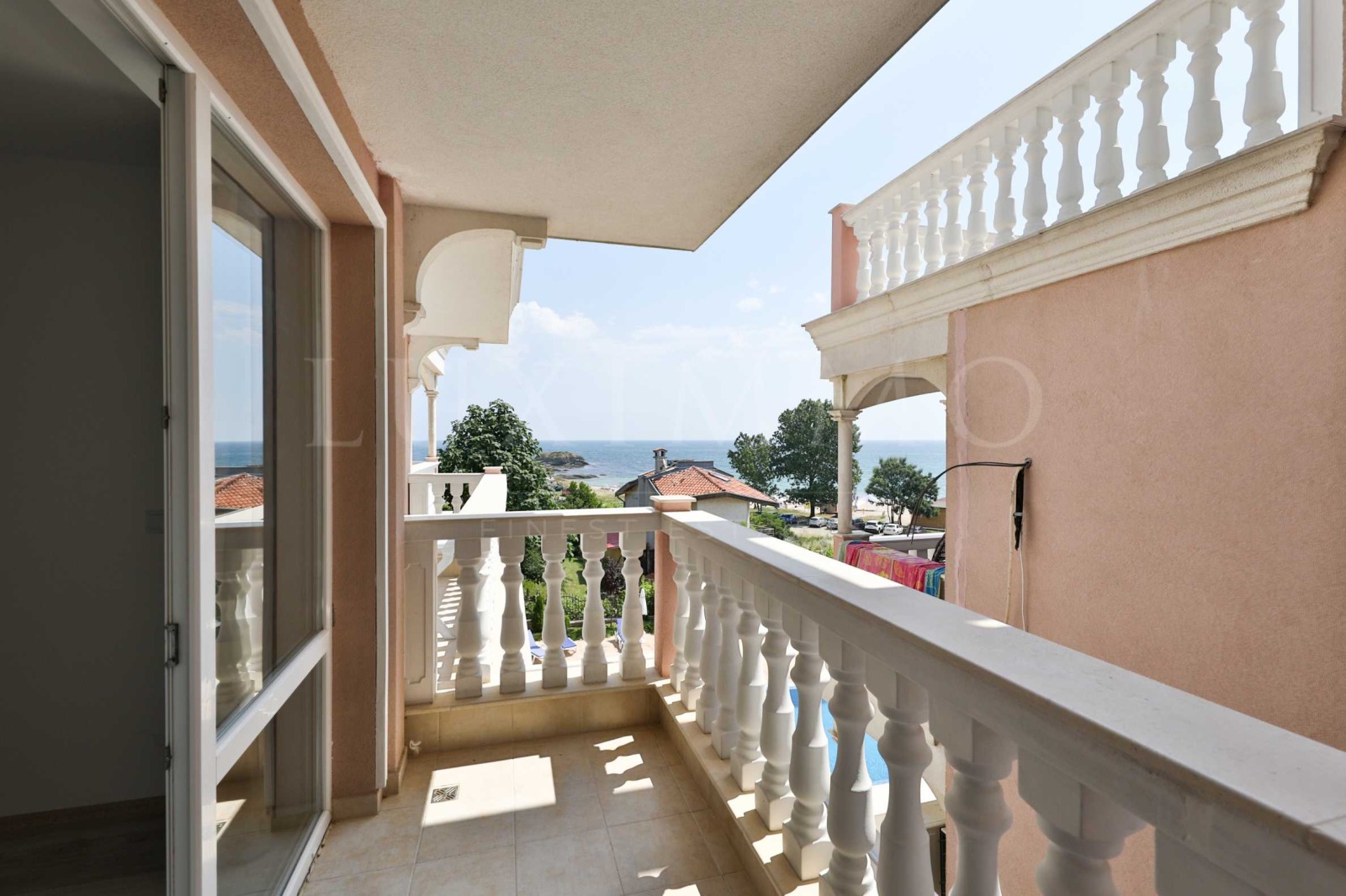 Апартаментът има тераса с красива гледка към морето, плажа и басейна.