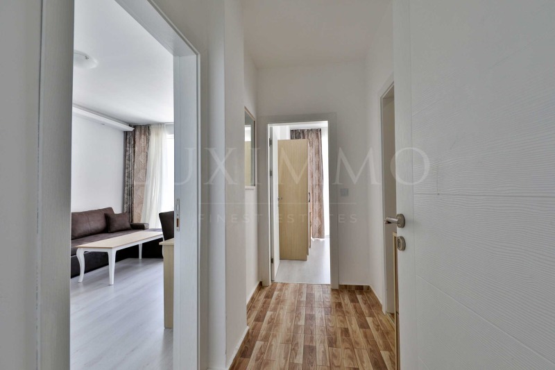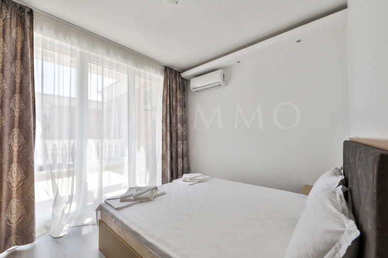 Апартаментът притежава панорамна тераса, ориентирана към морето, басейна и плажа, от 21.6 кв.м.