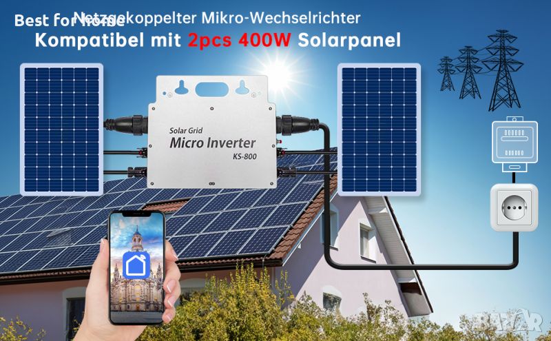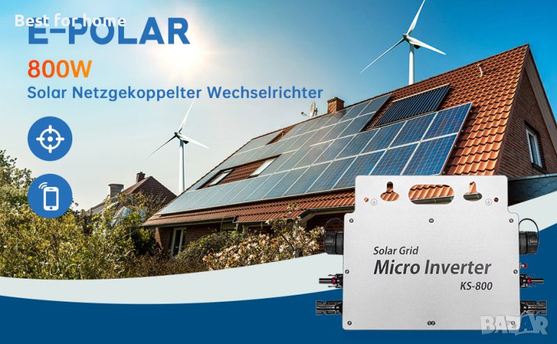 Малък микро инвертор за балконска електроцентрала 800 вата с висока мощност. Идеален за по-малки слънчеви балконски електроцентрали, напр. на балкони, градински навеси, гаражи или места със сянка. Слънчева балконска електроцентрала за захранване във вашата домашна мрежа. Микро инвертор 800 W е лесен за настройване и конфигуриране. Инверторът за свързване на мрежата от второ поколение: Балконна електроцентрала 800 W от второ поколение добавя функция за комуникация по мобилен телефон, която ви позволява да наблюдавате работното състояние на вашия инвертор по всяко време и навсякъде. Тази система Smart On Grid подобрява сигурността; максимизира добива на слънчева енергия; повишава надеждността на системата и опростява проектирането, инсталирането, поддръжката и управлението на соларни системи.