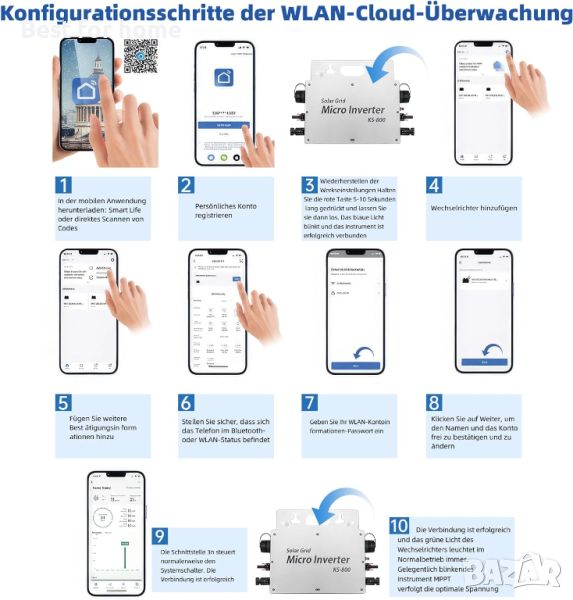 Фотоволтаичен инвертор 800 W с максимална фотоволтаична входна мощност от 2 x 400 W. Инверторът разполага с MPPT технология и осигурява чист синусоидален изход. Соларният инвертор е оборудван с приложение за управление и водоустойчив корпус. Черупката от алуминиева сплав може ефективно да предотврати ерозията от дъжд на повърхността. Микроинверторите обикновено се нагряват, тъй като всички електронни устройства генерират топлина. Инверторите използват алуминиеви сплави, които провеждат топлината по-добре. Ако температурата стане твърде висока, честотният преобразувател автоматично ще намали или изключи захранването, за да избегне прегряване. Стъпки за конфигуриране за WiFi облачно наблюдение: Проследявайте успехите на захранването си по всяко време. Благодарение на вградения WiFi интерфейс, можете да интегрирате този микро инвертор във вашата мрежа. Достъпът чрез приложението (Smart Life) е възможен по всяко време с вашия смартфон или таблет.