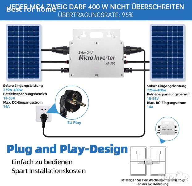 Обратно предаване на мощност - балконска електроцентрала 800 W използва технология за обратно ефективно предаване на мощност. Допълнителна мощност се подава в мрежата. Слънчевите инвертори могат да се подреждат последователно. За да отговори на по-високите изисквания за производителност, този микро инвертор може да бъде подреден