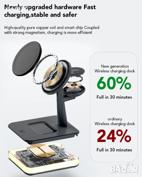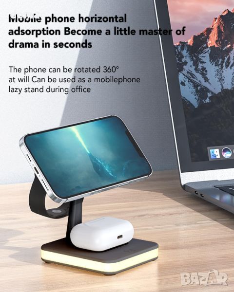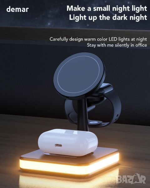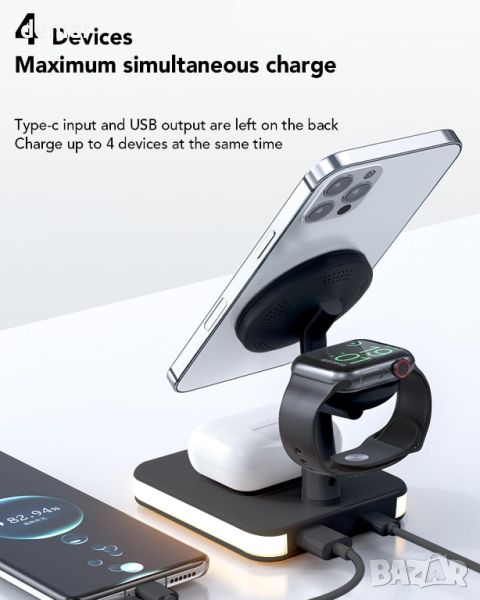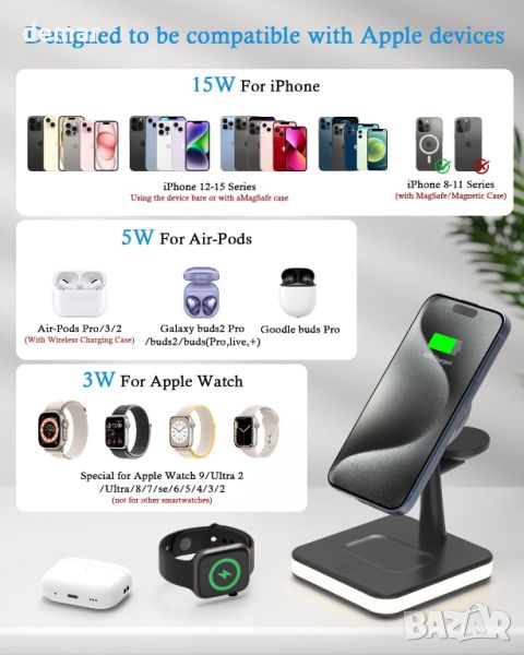 Магнитната безжична станция за зареждане е съвместима със серия iPhone 15/14/13/12, Apple Watch Ultra 2/Ultra/Series 9-2/SE/SE 2 и Mag-Safe AirPods 3/2, AirPods Pro. Разполага с регулируема LED нощна лампа с докосване и външен порт за зареждане на допълнителен телефон или устройство. Това зарядно устройство 3 в 1 ефективно зарежда вашия iPhone, Apple Watch и AirPods едновременно, елиминирайки заплетените кабели и е идеално за домашна или офис употреба. Вградените силни магнити и защитни функции осигуряват стабилно и безопасно зареждане. Пакетът включва зарядна станция 4 в 1, кабел за зареждане и ръководство за потребителя.