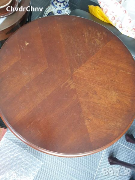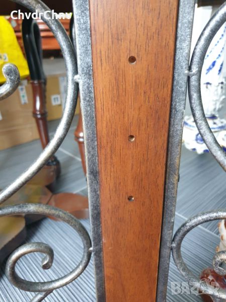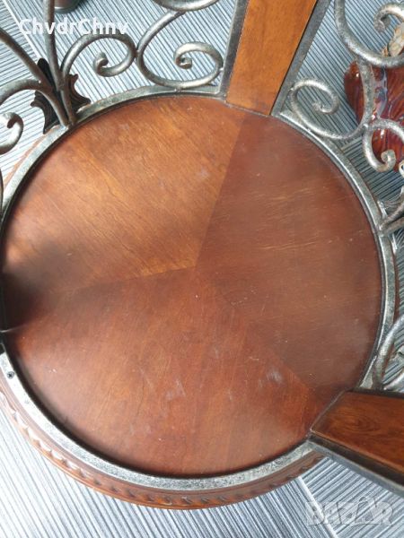 Височина 82 см, диаметър 59 см. Масивен (тежи около 30-40 кг), много запазен, от качествено дърво и дебел метал.