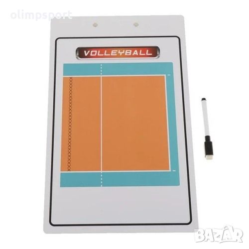 Клипборд треньорски за волейбол MAX, Комплект с маркер. Подходящ за учители и треньори по време на тренировки и мачове. За нагледно представяне на тактиката и съставяне на стратегия за защита или нападение на отбора и за разпределение на играчите по терена. Дъската е изработена от твърда пластмаса и има две страни – едната е със схема на цяло волейболно игрище, а другата е с половин терен в по-едър мащаб. На таблото може да се пише с маркера за бяла дъска с гъбичка, който е включен в комплекта. ВНИМАНИЕ! Не пишете с перманентен маркер! Към дъската могат да се захващат листове с формат А4 и тя да се използва като удобна подложка за писане и водене на бележки по време на играта. Размери дъска - 40х24 см. Тегло - 490 г. Материал - PVC.
