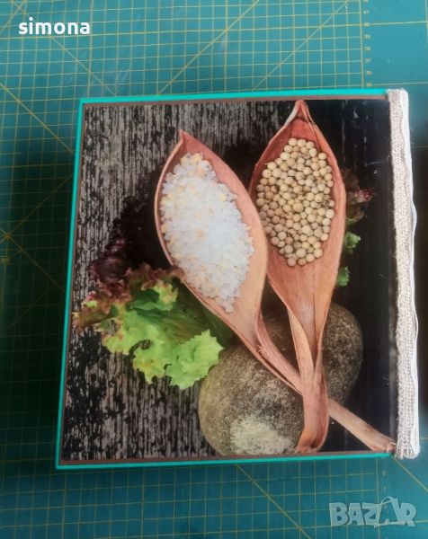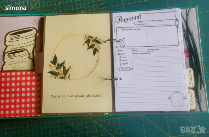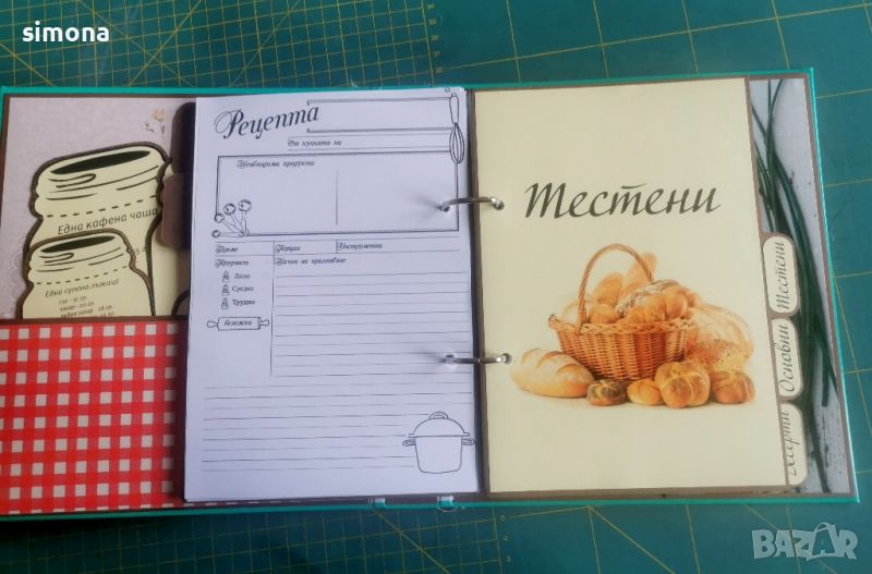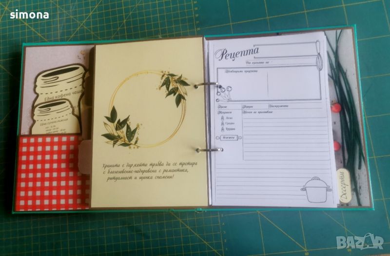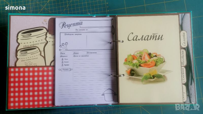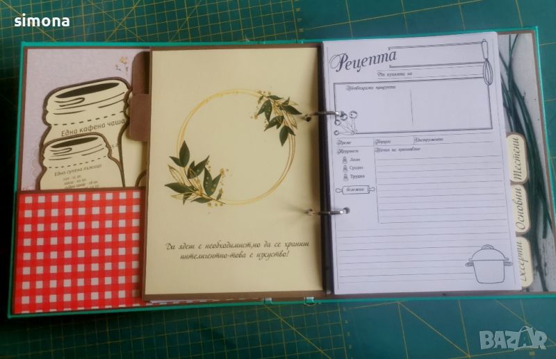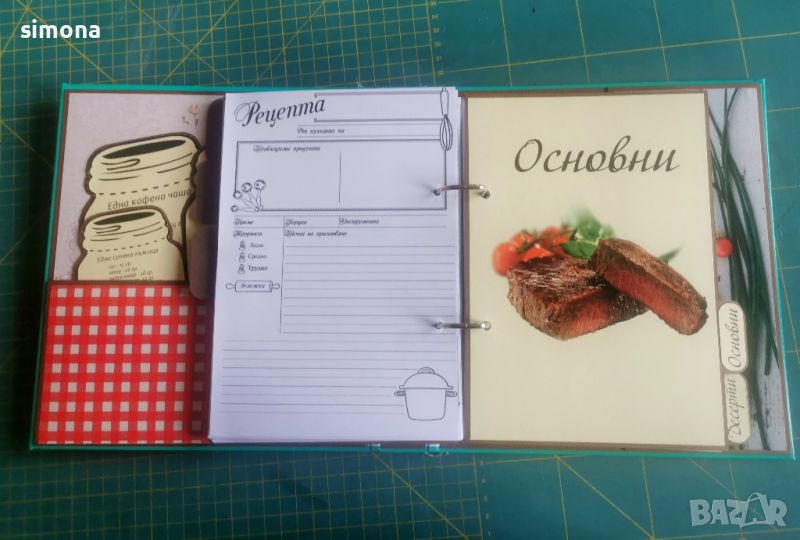 Предна корица с джоб и включени мерни кухненски единици, задна корица също с джоб за бележки Рецептурника е с ринг механизъм за добавяне на листове.