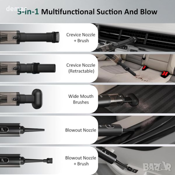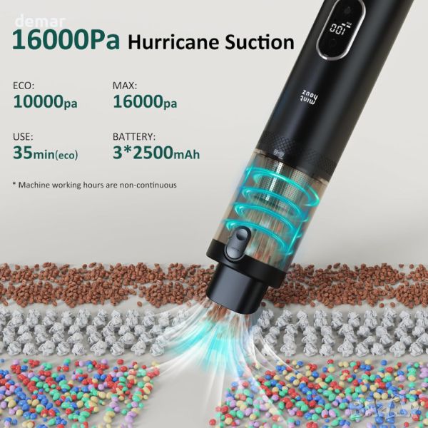 Ръчната безжична прахосмукачка предлага мощно засмукване с два режима: режим MAX осигурява 16000 PA за 18 минути интензивно почистване, а режим ECO предлага 10000 PA за 35 минути ежедневно почистване. Той разполага с високоефективен мотор, което го прави идеален за почистване на косми от домашни любимци, прах и отпадъци както у дома, така и в колата, като работи при ниско ниво на шум под 70dB. Оборудван с 5 многофункционални дюзи, той отговаря на различни нужди за почистване, включително пукнатини, кухненски чекмеджета, килими и др. Прахосмукачката има 7500mAh акумулаторна батерия с 3,5-часово бързо зареждане, LED дисплей за следене на мощността и LED светлина за тъмни зони. Включва двойна система за филтриране със стоманена мрежа и HEPA филтър, 150 ml чаша за прах и дизайн за отстраняване на прах с едно докосване. Лек и лесен за съхранение, той се предлага с чанта за съхранение за удобство, което го прави идеален за пътуване и къмпинг.