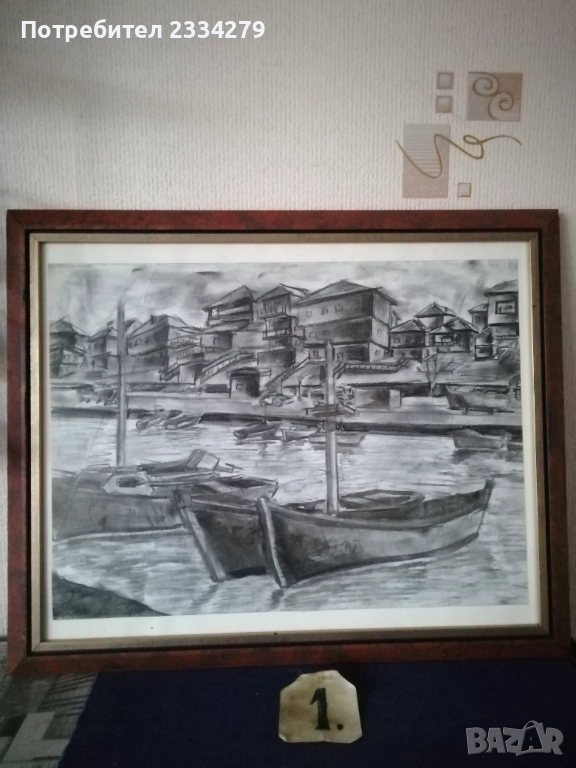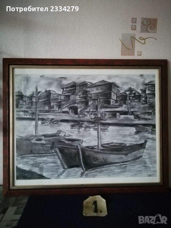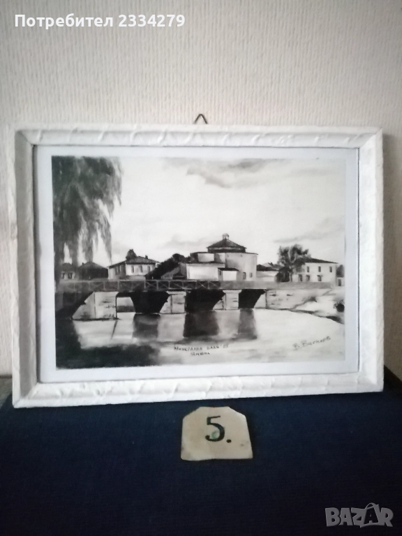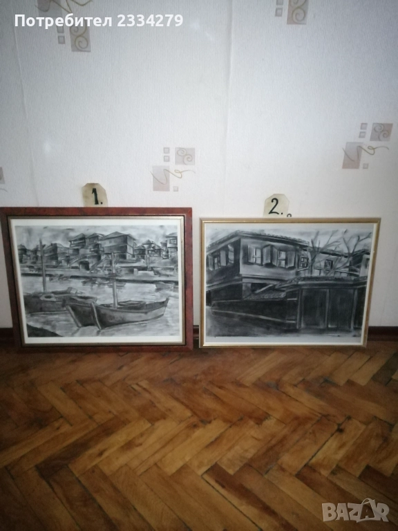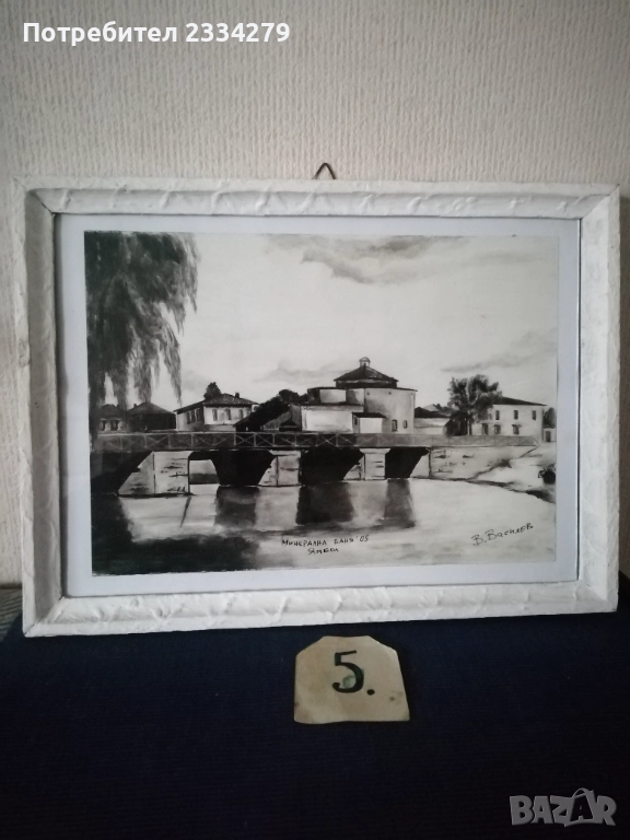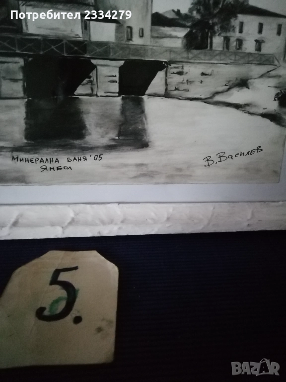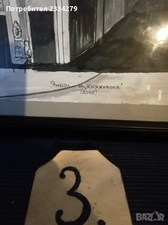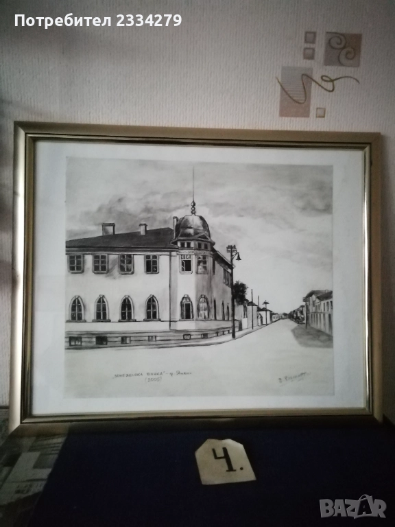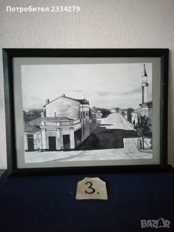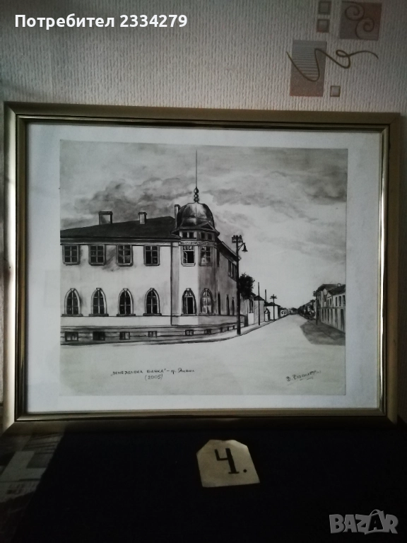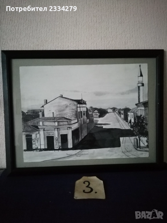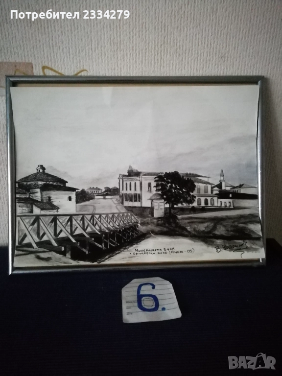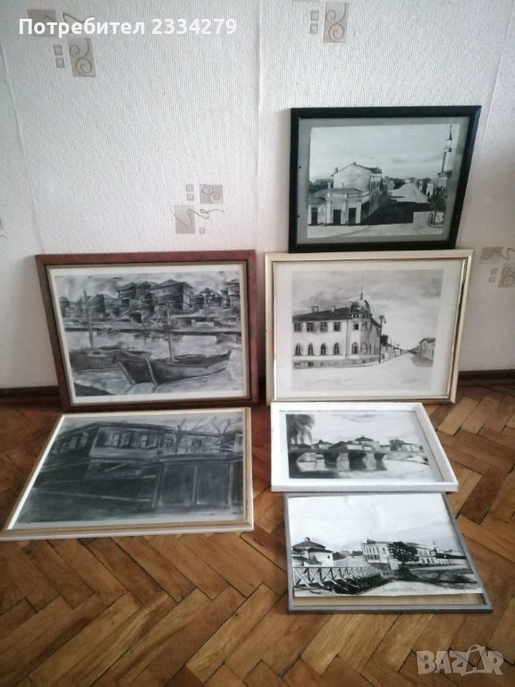 Картини графики рисувани от различни автори изобразяващи N:1,2графики от български автор изобразяващи ,,морски пейзаж градче с пристанище поставена е в орнаментирана остъклена рамка с размери 56х46см., цена 23€. Втората изобразяваща улица със стари къщи в дървена остъклена рамка с размери 54х44см., цена 18€. N:3, 4,5,6, авторски графики рисувани в Ямбол.,, Минерална баня" Ямбол. Поставена е в остъклена дървена рамка с размери: 44х32см. цена 13€.; ,,Земеделска банка гр. Ямбол(2005) В. Василев, размери: 55х45см.остъклена рамка, цена 18€.; Ямбол ул. Княжевска" (2005),дървена остъклена рамка с размери: 44х34см., цена 10€.