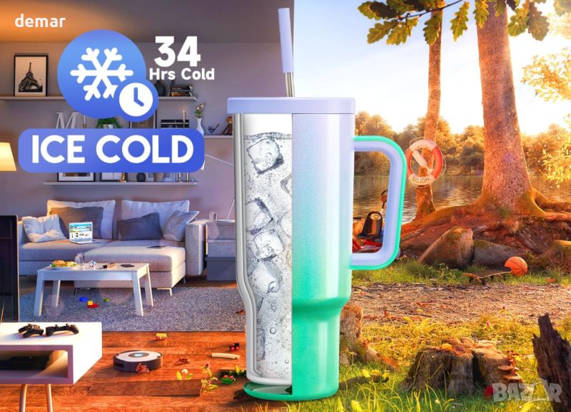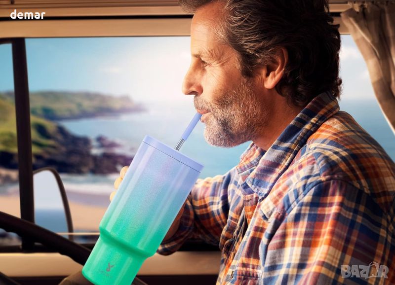 Чашата Meoky от 40 унции с дръжка разполага с двойна вакуумна изолация, която поддържа напитките студени за 34 часа и топли за 10 часа. Може да се похвали със 100% непропусклив капак, дори без сламката, и силиконов накрайник за премахване на металния вкус. Проектирано за удобство, заостреното дъно на чашата пасва на поставки за чаши в кола, докато неплъзгащата се основа гарантира стабилност. Лесната за хващане дръжка е подплатена със силикон за комфорт и устойчивост на приплъзване. Изработена от висококачествена неръждаема стомана 304, чашата без BPA е устойчива на ръжда, вдлъбнатини и пренасяне на аромати.