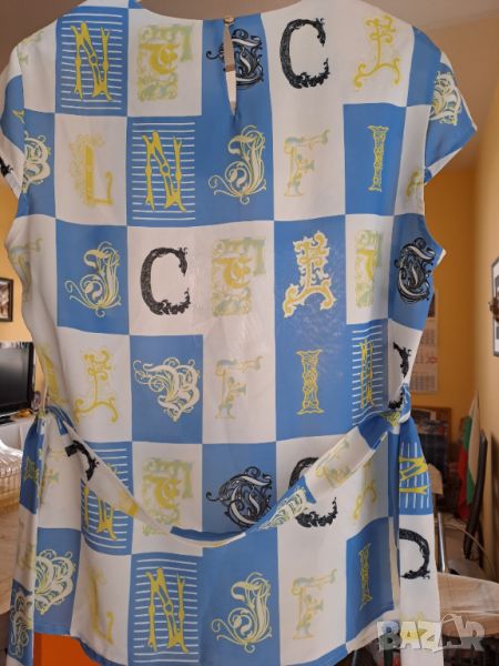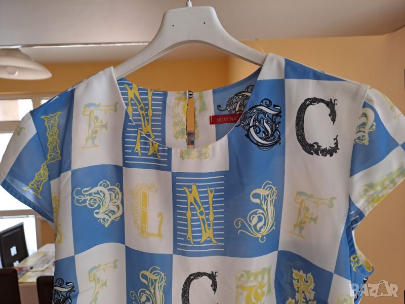 Дамска блуза с къс ръкав Novena, с допълнително коланче, с много красиви шарки. Материята е лек, ефирна, много красиво пада. Европейски размер 42, български №48. Блузата е нова. Отговарям на съобщения тук, изпращам с куриер с отстъпка, преглед и тест, или лично предаване в София.
