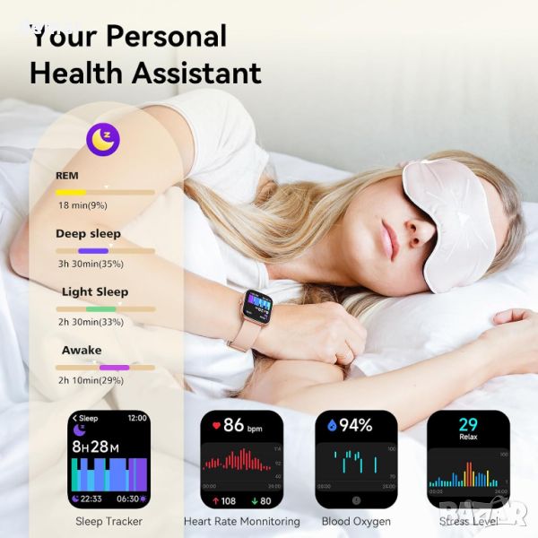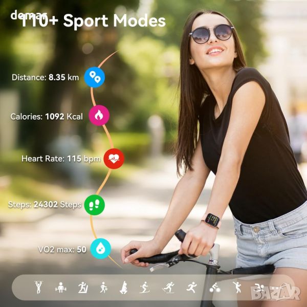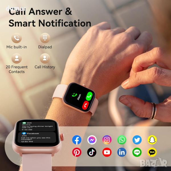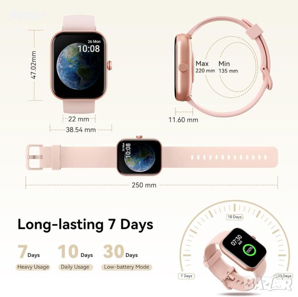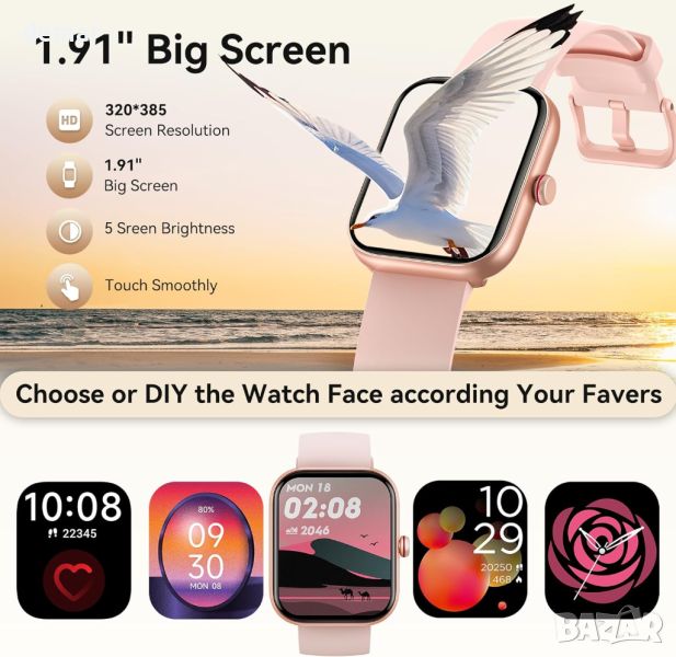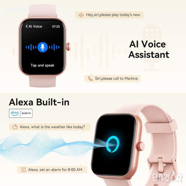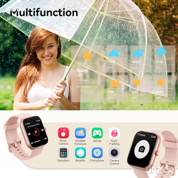 Надграденият смарт часовник Fitpolo от 2024 г., оборудван с Bluetooth BLE 5.3 и професионален DSP аудио чип, осигурява превъзходно качество на звука и 2 пъти по-дълъг обхват на Bluetooth до 20 метра за обаждания и известия от 20+ приложения. Той разполага с двоен интелигентен достъп с вграден Alexa и AI гласов асистент, позволяващ контрол на интелигентни домашни устройства и функции на телефона. Часовникът следи пулса, SpO2, стреса и качеството на съня и включва функция за здравето на жените. Проектиран за активен начин на живот, той предлага 110+ спортни режима, водоустойчивост IP68 и проследява различни фитнес показатели. 1,91-инчовият HD сензорен екран, 7-9 дни живот на батерията и съвместимост с Android 6.0+ и iOS 9.0+ гарантират лесна употреба. Допълнителните функции включват часовник, прогноза за времето, намиране на телефон, фенерче, управление на камера и музика, игри, календар, калкулатор, напомняне за вода и др. Идеален за начинаещи и идеален подарък за любими хора.