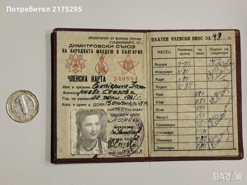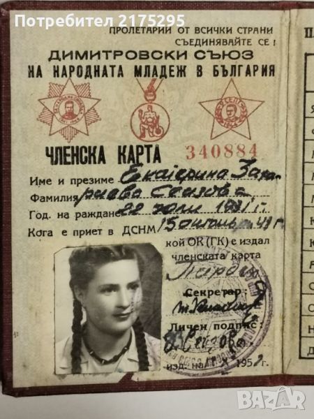 Членска карта ЦК на ДСНМ-1949г. → Обява 46653619