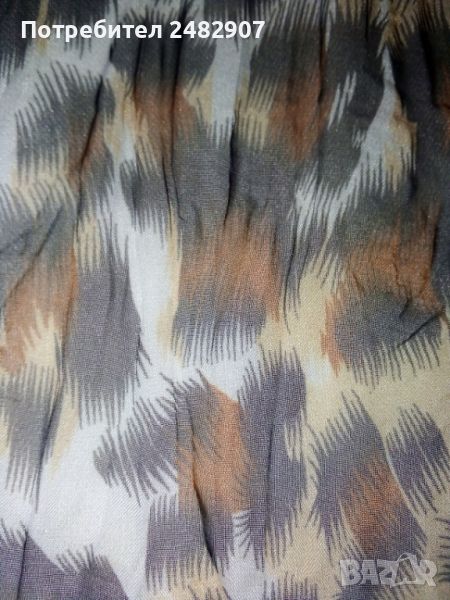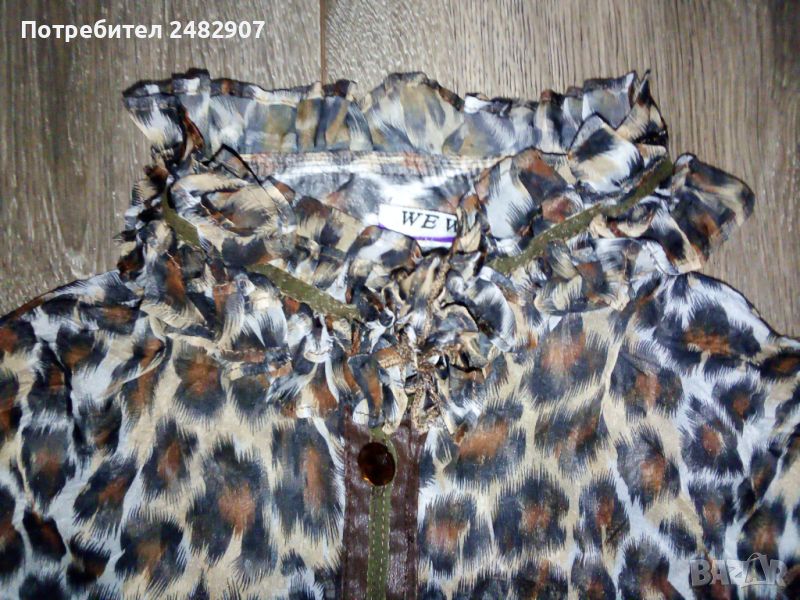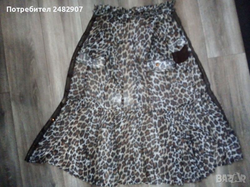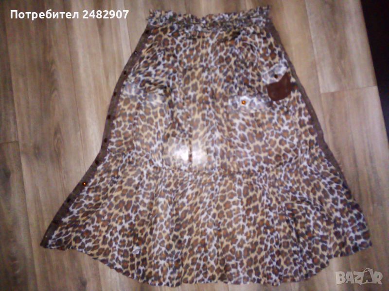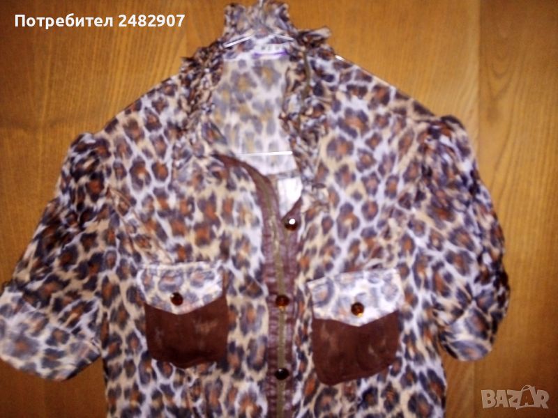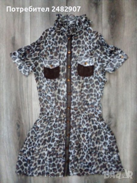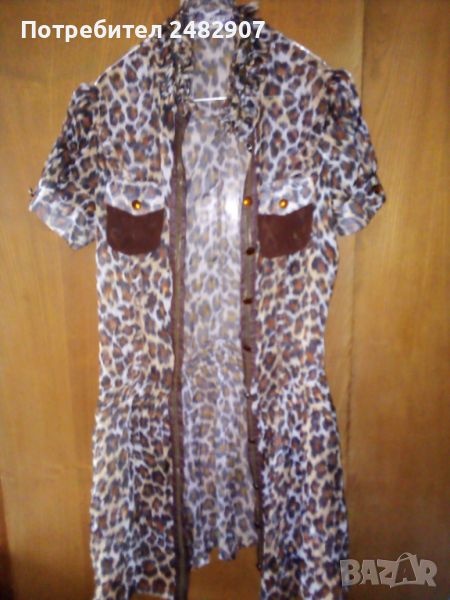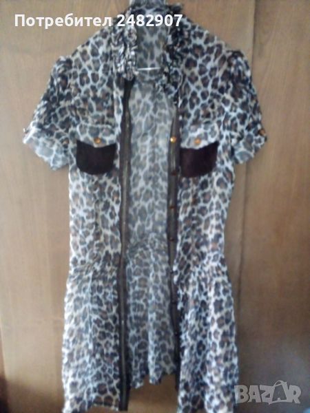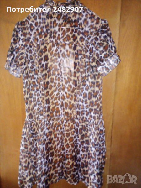Къса дамска плажна рокля с леопардов принт, размер S. Съдържа 100 % полиестер. Ширина в раменете - 36 см, ширина под мишниците - 46 см, ширина в талията - 36 см, ширина в долната част - 69 см, дължина от рамото до долу - 85 см, дължина на ръкава от рамото - 19 см, ширина на ръкава в долната част - 15,5 см. Много запазена, почти не е използвана, прозрачна, с мачкан ефект и закопчаване с 10 броя блестящи копчета.