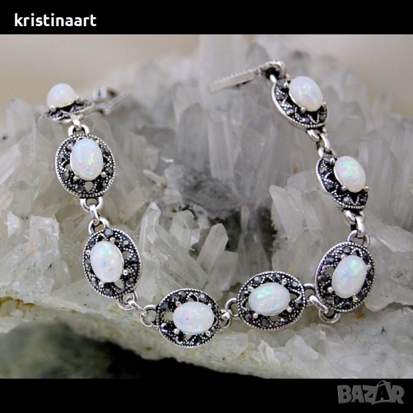 Гривна от тибетско сребро с бял опал и синтетични марказити