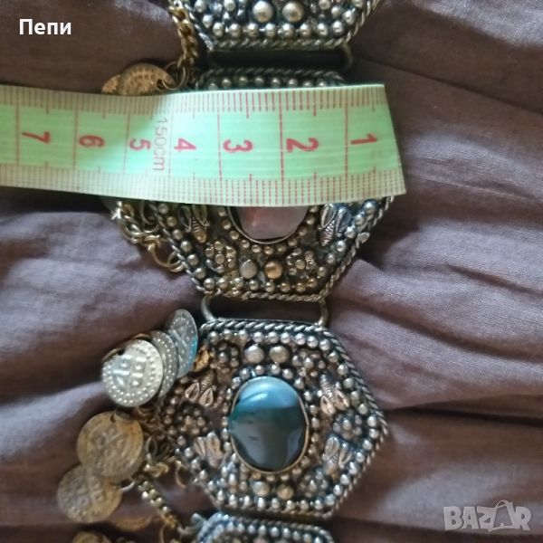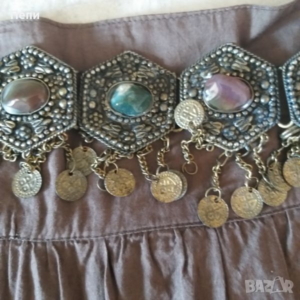 Метален, масивен колан с вградени естествени камъни. Дълж. 70 см. Има удължение за закопчаване 16 см.