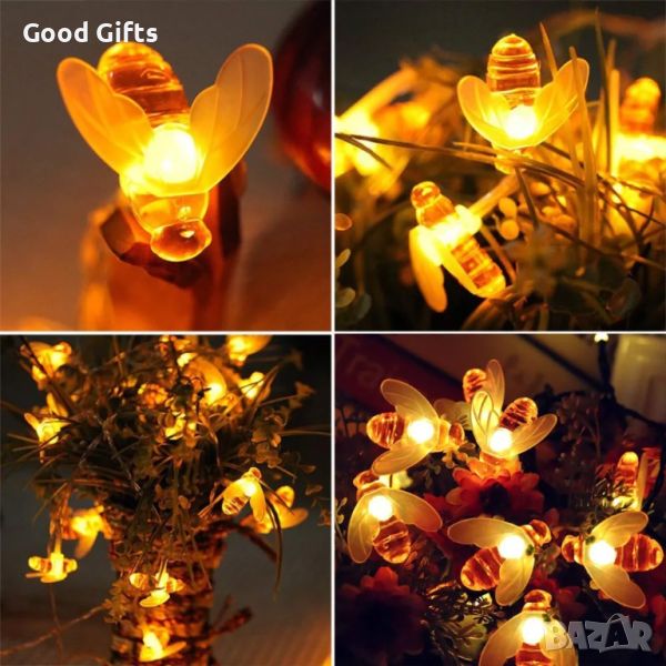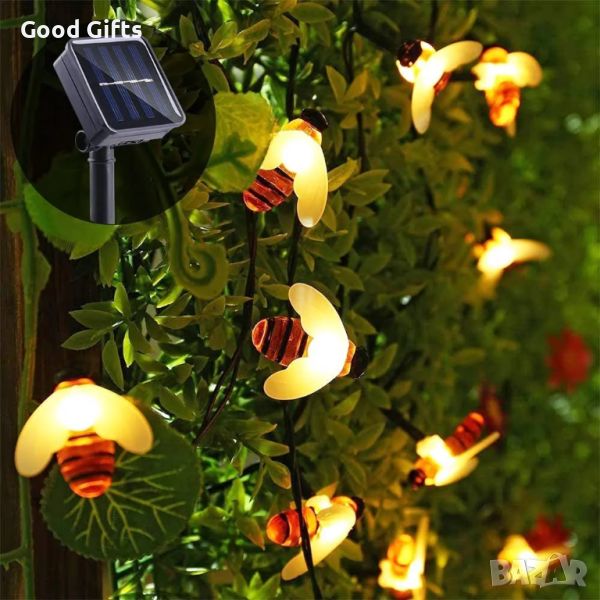 Ако обичате красивата декорация и искате да създадете магическа обстановка в своя двор или дом, то този гирлянд от светещи пчели със сигурност ще ви помогне да постигнете невероятен ефект. Гирлянда няма нужда от постоянна поддръжка, той е водоустойчив и неговото захранване се осигурява от соларен панел, който е включен в комплекта. По този начин за да бъде красива вашата градина или дом вечерно време и осветени от мека приятна светлина, нямате нужда от много средства и време за поддръжка. Пчелите са изработени реалистично, от екологични материали, които не предизвикват замърсявания.