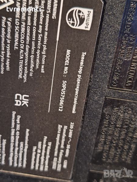 Захранваща платка , 715GA008-P01-002-003S for Philips50PUS7506/12 for 50inc DISPLAY TPT500WR-PV7D.Q REV.S2U Борда е гарантирано работещ Демонтиран от телевизор Philips модел 50PUS7506/12 със счупен дисплей TPT500WR-PV7D.Q REV.S2U тествана от нашия техник