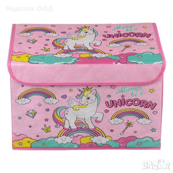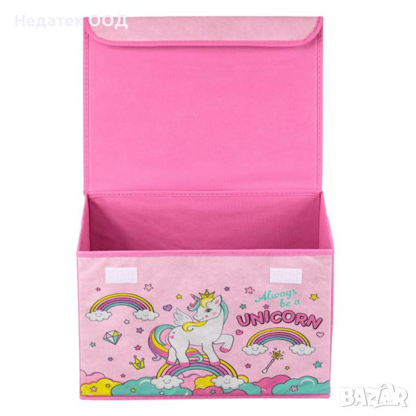 Детска кутия за съхранение с капак, розов плат с дизайн на еднорог. Има здрави стени и се затваря със самозалепващи ленти. Поставя се на рафт, в гардероба или под леглото и е идеален за дрехи, играчки или книги.