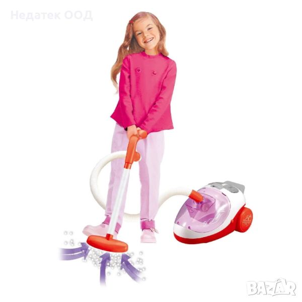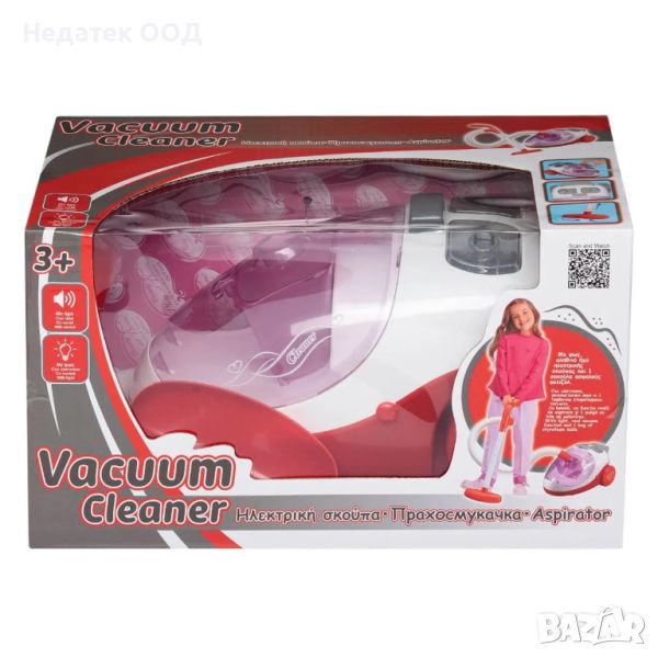 Детска прахосмукачка голяма в червен и бял цвят с On/Off бутон, звуци на работа и светлина. Съдържа и торба от безопасен стиропор за събиране на метлата. Работи с 2 батерии тип С (не са включени).