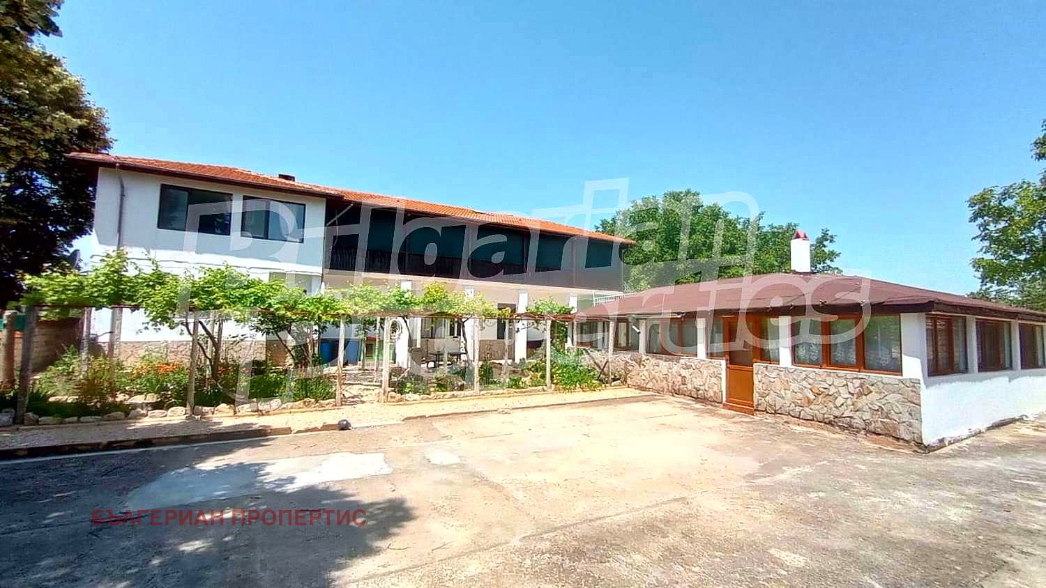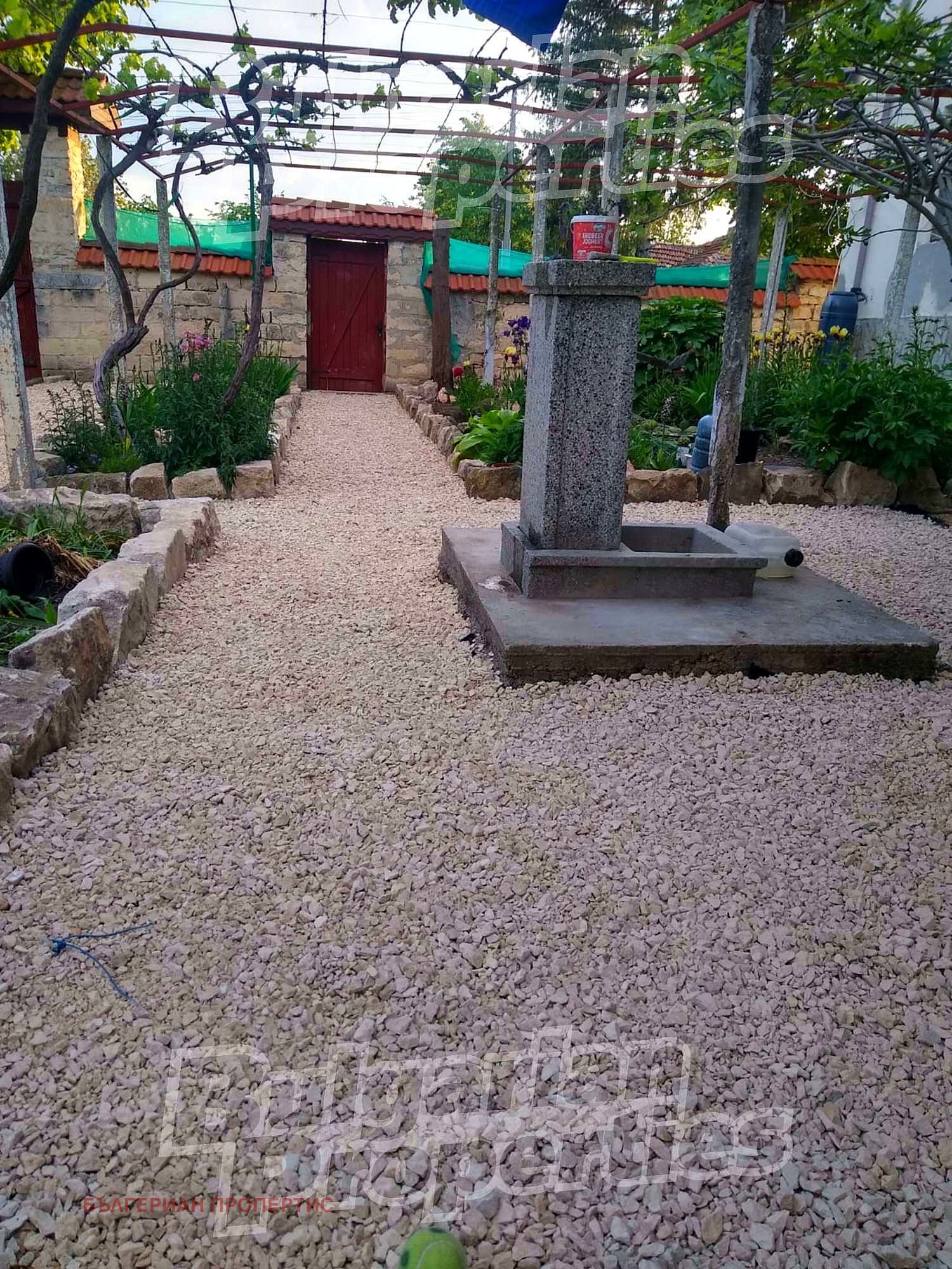 Дворът е просторен и добре поддържан. Оградата е масивна. Пред къщата има асма с приятно място за отдих. До входа е обособено място с чакъл, където могат да паркират до 6 автомобила.