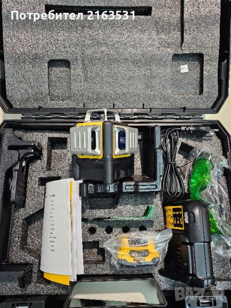 Чисто нов лазерен нивелир. Не е ползван.Оставаща гаранция 2 години.ХАРАКТЕРИСТИКА:Брой лъчи: 3 x 360° (хоризонтално и вертикално)Лазерен диод: зеленКлас на лазера: 2, 1mWВреме за самонивелиране, тип.: n/аБатерия: 10,8V, 2 Ah li-ionОКОМПЛЕКТОВКА:батерия 12 V/2Ah Li-Ionзарядно DeWalt DCB107магнитна скоба за монтажшпатула за меренеочилакуфар