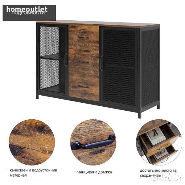 Универсалният бюфет е изработен от висококачествено дървено ПДЧ и черна лакирана метална рамка, много стабилна, което увеличава товароносимостта му. Благодарение на гладката си повърхност, той изисква минимални усилия за почистване. Бюфетът има 3 чекмеджета и 2 решетъчни шкафа и предлага достатъчно място за вашите книги, кухненски прибори и др. у дома или в офиса.
