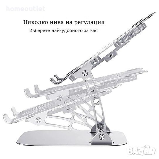 Стойката за лаптоп е изработена от алуминиева сплав, която е по-здрава и издръжлива от пластмасата. Алуминият също по-добре абсорбира топлината от лаптопа.