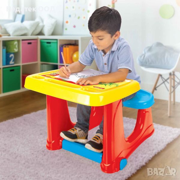 Цветно детско бюро с ергономична поставка за крачета и удобна седалка. Масата за бюро е с размери 51х42 см и има 3 джоба за моливи и гуми. Съдържа 10 предварително отпечатани страници за оцветяване и 8 пастели за безкрайни часове забавление.