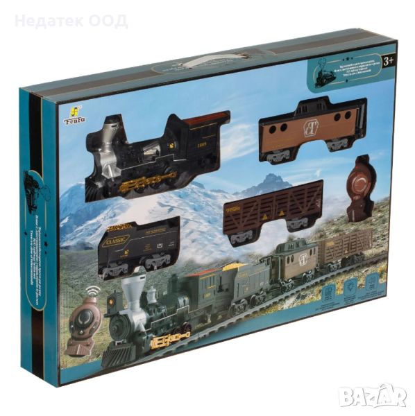 Играчка за момче, влакче с дистанционно управление с 3 коли и двигател. Има 16 песни за свързване, светодиодни светлини и реалистични звуци от влакове. Има дистанционно, бутон за регулиране на скоростта, бутон за музика и бутон за тромпет. Работи с 4 AA батерии за влака (не са включени) и 2 AA батерии за контролера (не са включени).