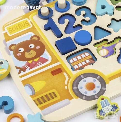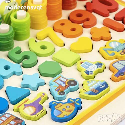 УЧИ - пъзел от дървени мъниста също е много добър за изучаване на числа и може да бъде полезен и при извършване на прости математически операции . С негова помощ детето бързо ще се научи да разпознава цветовете и да създава геометрични фигури с мъниста.