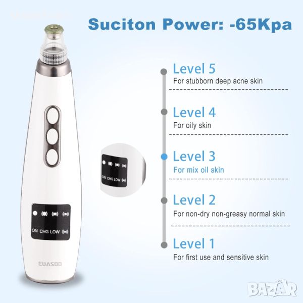 - Подходящ за различни кожи: Нашият препарат за премахване на черни точки приема 5 различни сонди за засмукване и нива, които са предназначени за различни типове кожа, за да се постигне истинско дълбоко почистване. Ниво 1 е подходящо за чувствителна и суха кожа, ниво 2-3 е подходящо за неутрална кожа, ниво 4-5 е предназначено за смесена и мазна кожа.