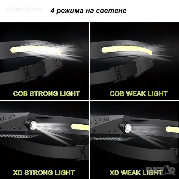 Акумулатореният LED челник има интелигентен сензорен режим, който ви позволява да го включвате или изключвате без натискане на бутони. Светодиодният челник има 5 режима на светене: COB лампа 100%, COB лампа 40%, фенерче 100%, фенерче 40% и мигащ режим (активира се с продължително натискане на ключа).