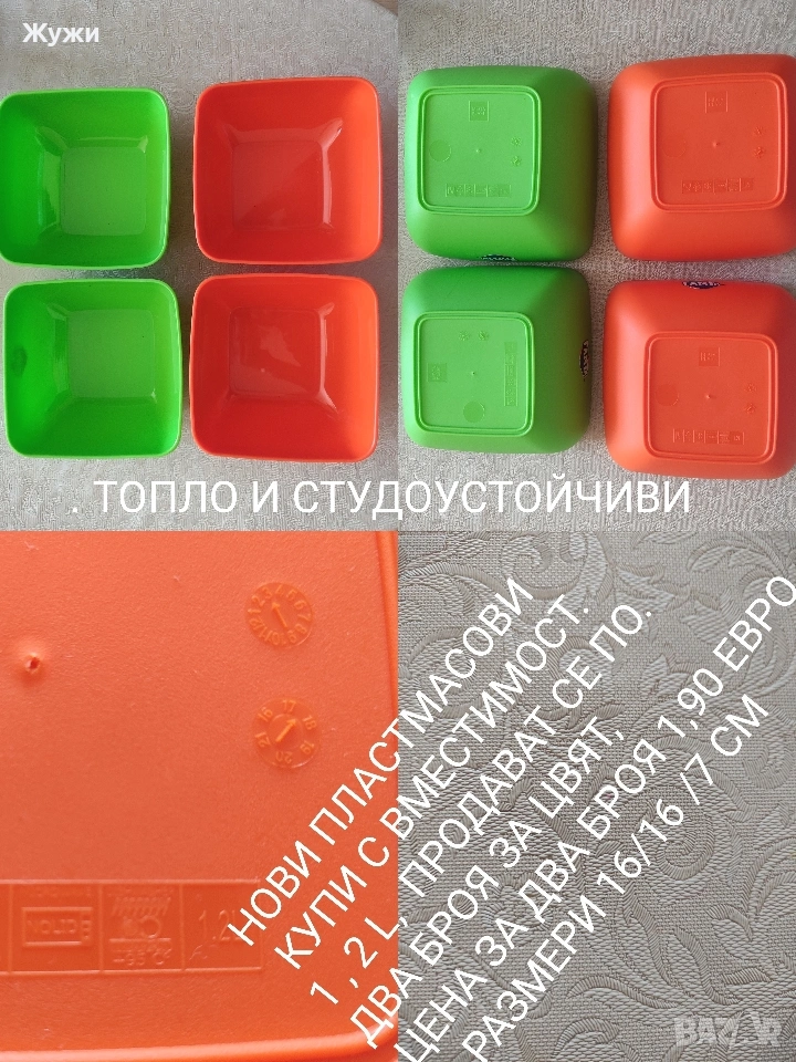 НОВ дървен чук за месо, с два вида накрайник за начукване. налични два броя. цена 2, 90 лв. Следва комплект от нови фунии, два броя, цена 2,10 лв. НОВА сокоизтисквачка пластмасова цена 2, 20 лв. НОВИ пластмасовите купички,три броя тъмносиви ,цена за комплект от трите броя 3,90 лв. НОВИ два броя ножове по 1,90 лв за брой. ТРИ броя пластмасови кутии за подправки или друго, използвани еднократно,но са без никакви забележки ,цена за комплекта 4,50 лв.. НОВИ четки за почистване на всякакъв вид дамаски много леки и удобни за хващане цена за брой 2,50лв. СЛЕДВА нов органайзер за чинии капаци и други ,цена 6.90 лв има дадени размери.НОВИ дървени поставки за горещи съдове цена за брой 2,50 лв. НА следващата снимка е нова купа, пластмасова за дома, с платно затварящ се капак, вместимост един литър , цена 2 90 лв.