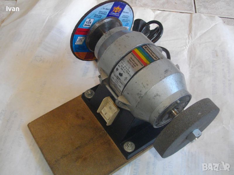 Шмиргела е без странични метални предпазители на дисковете си. Махнати са, за да може да се слагат големи размери камъни/дискове. Поставен на машината в ляво нов диск шлифовъчен финно шлайфане и рязане на тухла/газобетон/итонг, размер ф 125 мм, оригинален немски, марка Top Craft.