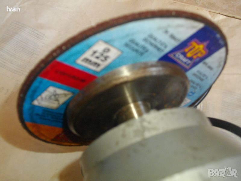 Диска е за рязане и за шлайфане. Поставен от дясна страна нов дисков шлифовъчен диск камък сив универсален абразив средна твърдост - български, размер ф 110мм, ширина 20 мм.