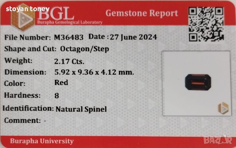 Естествен шпинел с тегло 2.17кт. и произход Мианмар. Чистота VS без видими включения. Цвета е топ императорско червено. Форма октагон с размери: 9.36 х 5.92 х 4.12мм.