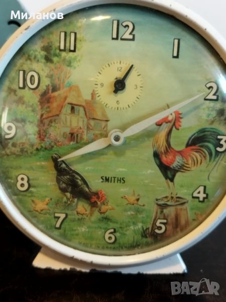 Стар механичен английски анимиран будилник Smiths, работи и звъни.Над 60 годишен.Диаметър-120 милиметра.Наличен и същия, но квадратен