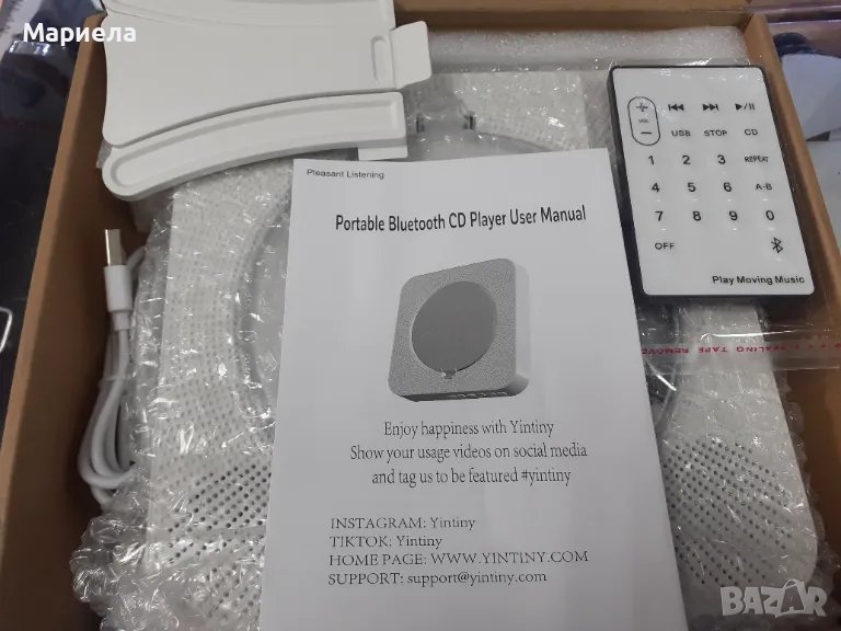 (Bluetooth CD плейър и високоговорител) Вграденият Bluetooth предавател и Bluetooth приемник могат не само да се свързват с Bluetooth високоговорители и слушалки; но също така се свързват с мобилни телефони; компютри и други устройства чрез Bluetooth; обхват на покритие на Bluetooth от 10 м