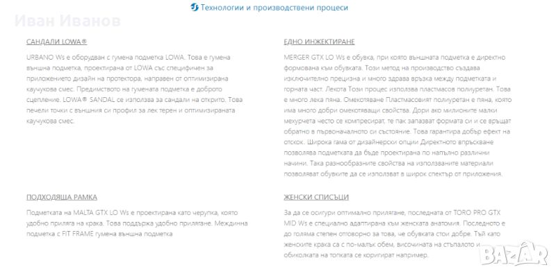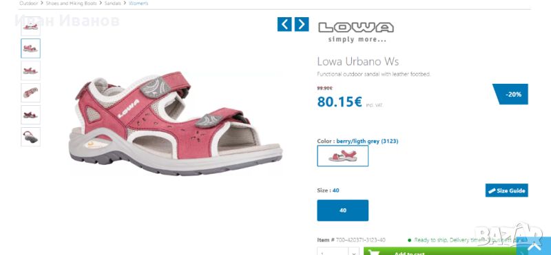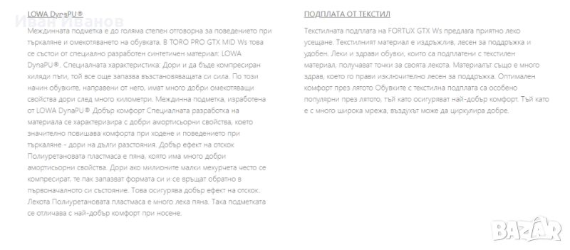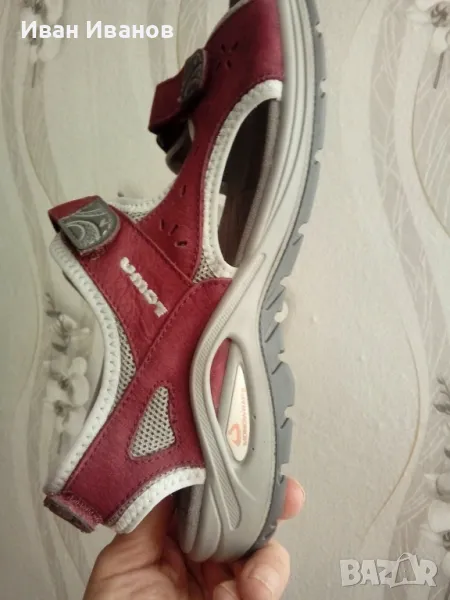 Lowa Urbano WsНови , само пробвани Перфектни Марка с доказани качества Всеки, който обича да е много навън, дори при много високи температури, може да изпита нужда да даде на краката си малко повече въздух. Тук се намесва моделът URBANO Ws. Спортно приличен на външен вид, стабилен, нехлъзгащ се и удобен, дамският сандал предлага оптимална функционалност - независимо дали в слънчев ден на почивка или на продължително градско пътуване.URBANO Ws е оборудван с гумена подметка LOWA. Това е гумена външна подметка, проектирана от LOWA със специфичен за приложението дизайн на протектора, направен от оптимизирана каучукова смес. Предимството на гумената подметка е доброто сцепление. LOWA® SANDAL се използва за сандали на открито. Това печели точки с външния си профил за лек терен и оптимизираната каучукова смес..LOWA DynaPU®Междинната подметка е до голяма степен отговорна за поведението при търкаляне и омекотяването на обувката. В TORO PRO GTX MID Ws това се състои от специално разработен синтетичен материал: LOWA DynaPU®. Специалната характеристика: Дори и да бъде компресиран хиляди пъти, той все още запазва възстановяващата си сила. По този начин обувките, направени от него, имат много добри омекотяващи свойства дори след много километри. Междинна подметка, изработена от LOWA DynaPU® Добър комфорт Специалната разработка на материала се характеризира с добри амортисьорни свойства, което значително повишава комфорта при ходене и поведението при търкаляне - дори на дълги разстояния. Добър ефект на отскок Полиуретановата пластмаса е пяна, която има много добри амортисьорни свойства. Дори ако милионите малки мехурчета често се компресират, те пак запазват формата си и се връщат обратно в първоначалното си състояние. Това осигурява добър ефект на отскок. Лекота Полиуретановата пластмаса е много лека пяна. Така подметката се отличава с най-добър комфорт при носене.