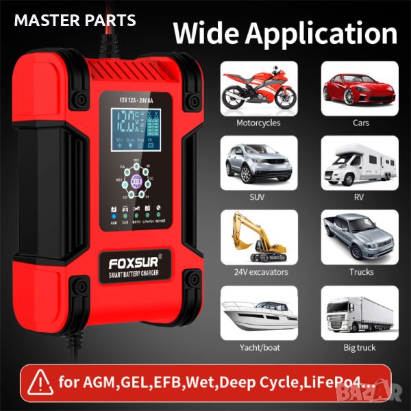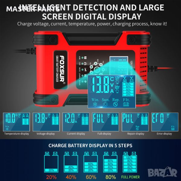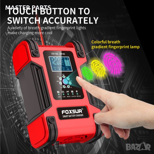 Интелигентно СМАРТ зарядно FOXSUR функция ДЕСУЛФАТИЗАЦИЯ , с цифров дисплей,12V / 12A, 24V /6A