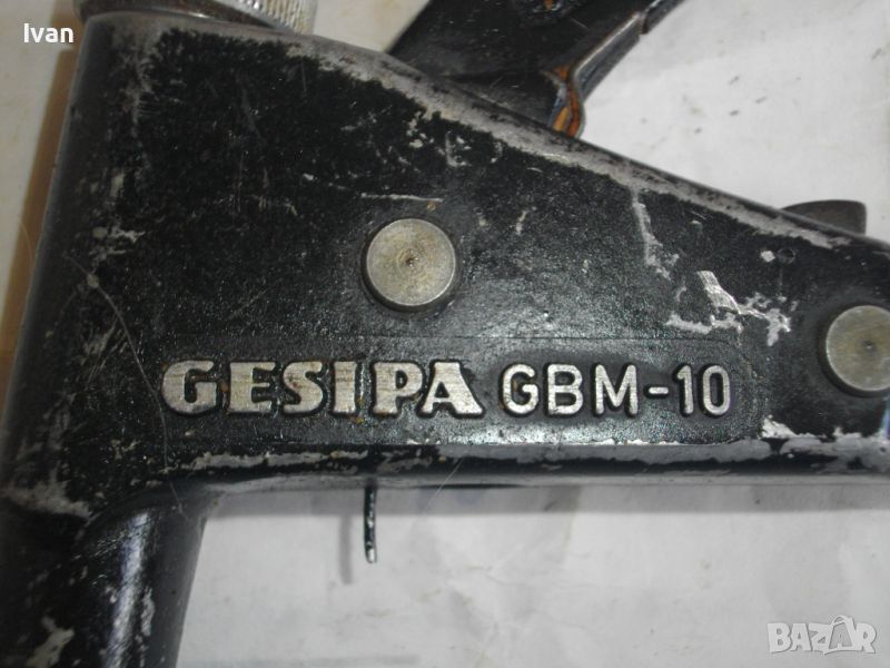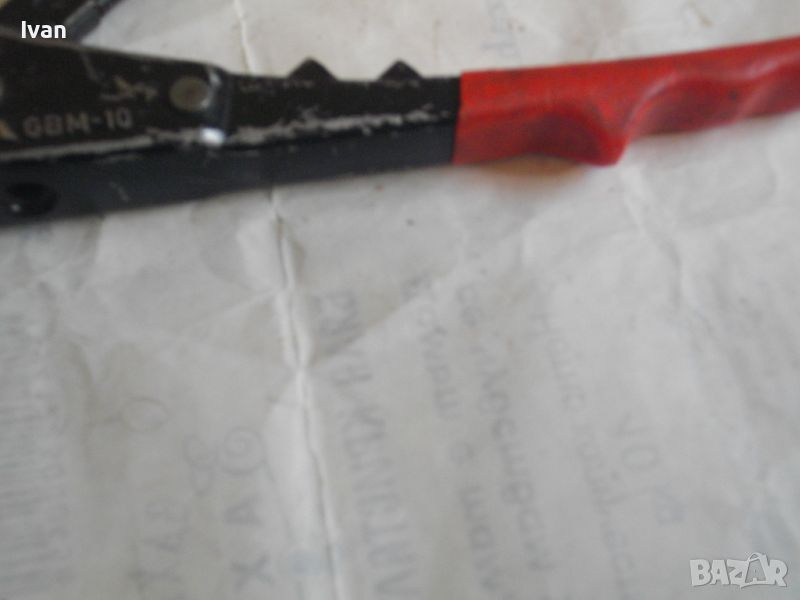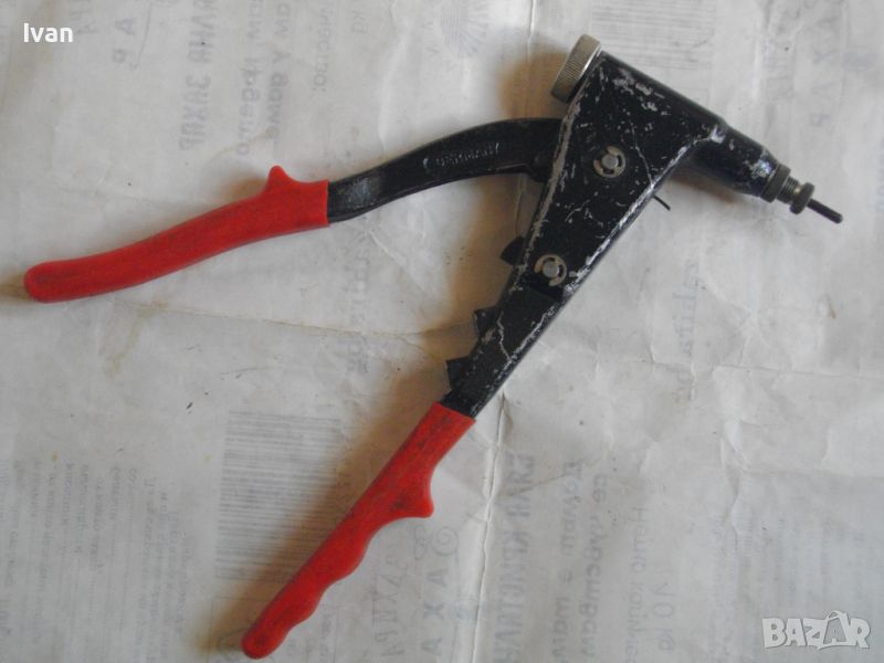 ОПИСАНИЕ на ръчна нитачка за нит гайки 4-6 мм GESIPA - цена 99 лв. Марка и модел - GESIPA GBM-10. Производство - оригиналното немско - Made in GERMANY. Визуален запазен външен вид. Нитачката е със ЗАБЕЛЕЖКА по техническото си работно състояние. ГлАвата отпред е налична, нитачката работи, но липсва реглажа/регулацията за размер на нит гайка 4-6 мм. Липсващата част е на предната дръжка - алуминиев върток, който липсва /отвил се е и е изпаднал. Механизма под липсващият върток е наличен и стой на нитачката. Ниската цена на нитачката 99 лв е съобразена със забележката. Нова нитачка от модела в БГ се предлага в ценови диапазон средно около 190-200 лв. Дължина на инструмента - 250 мм. Алуминиева глава ,алуминиево тяло на инструмента, гумирани нехлъзгащи се покрития на дръжките.