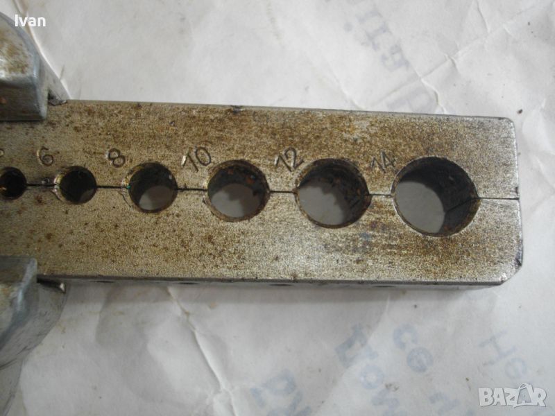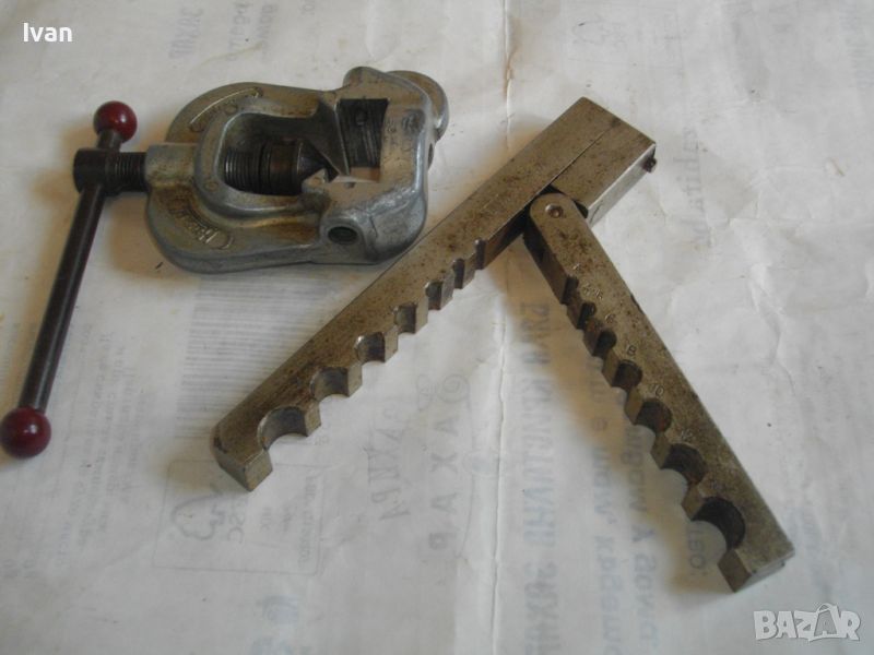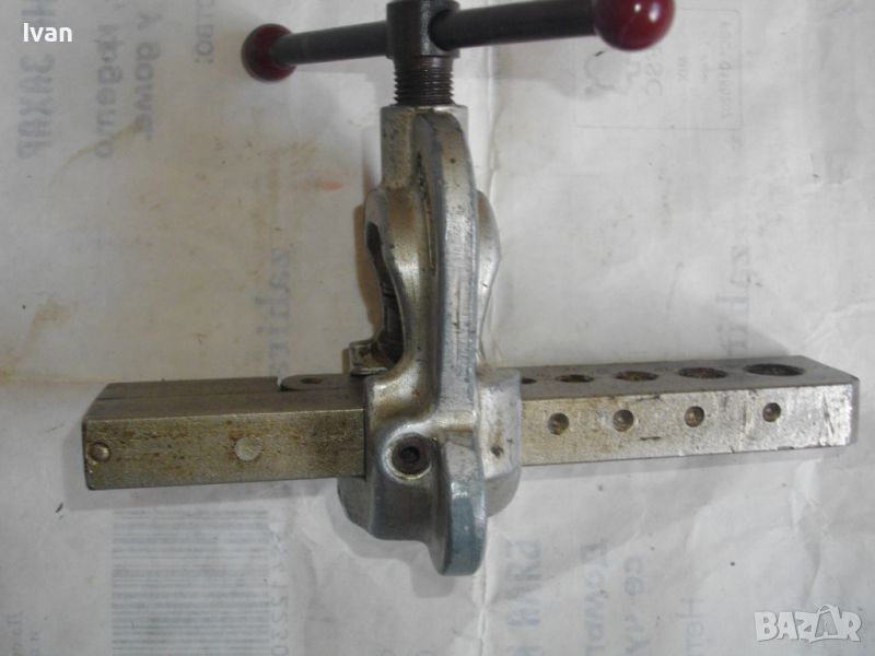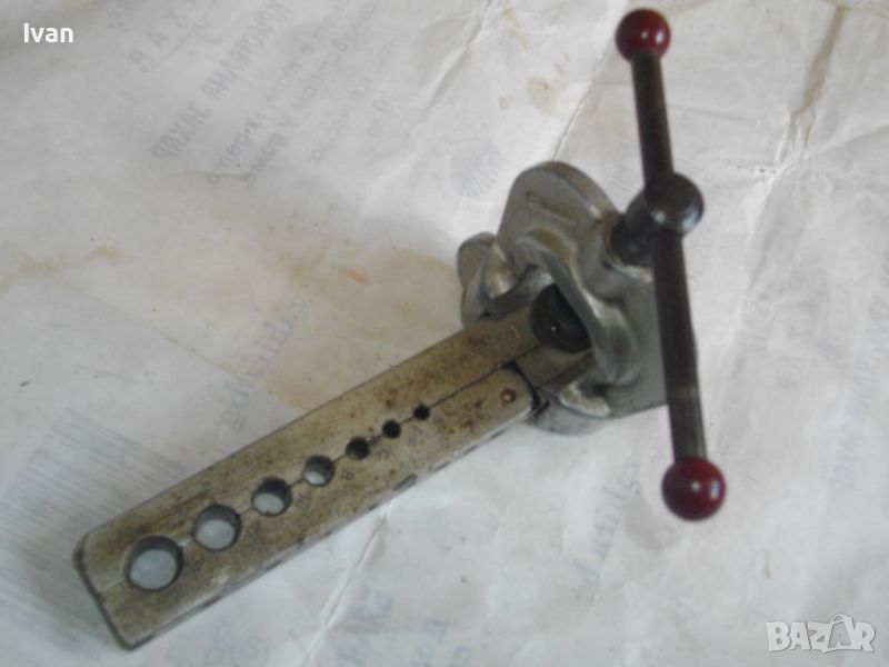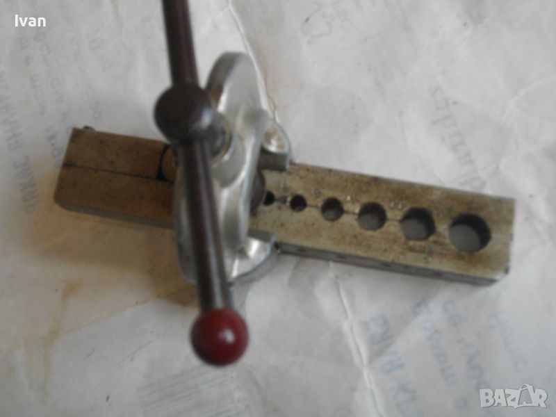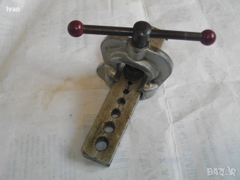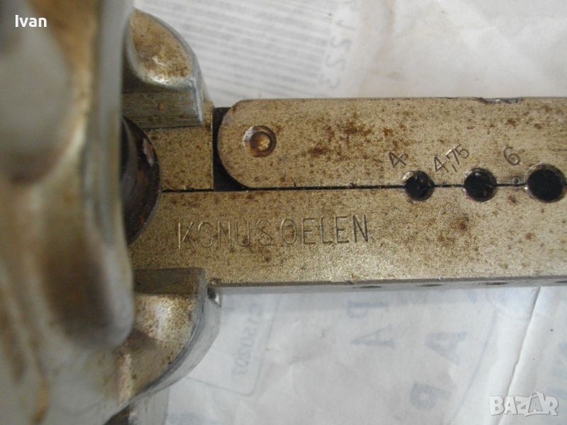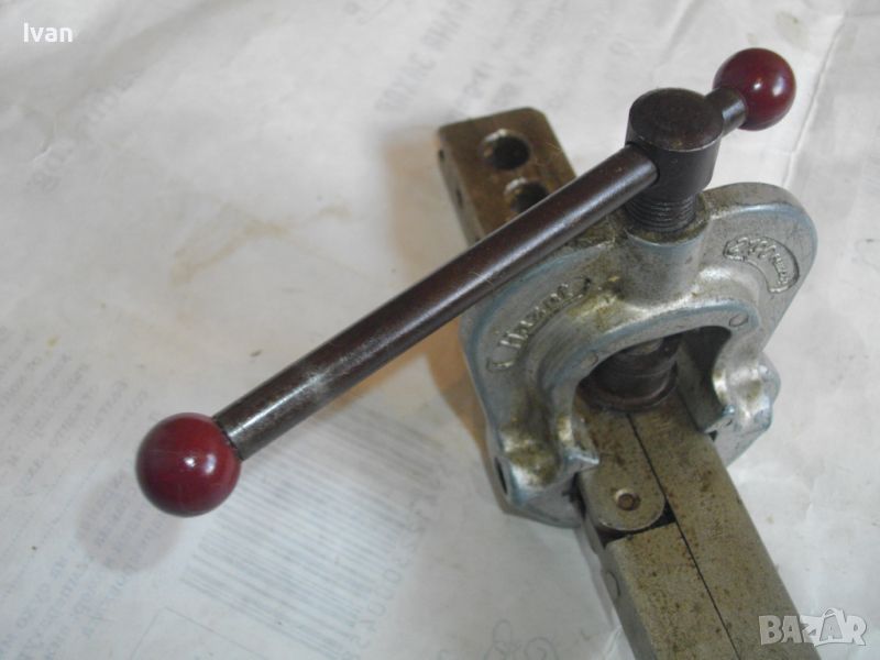 ОПИИСАНИЕ на конусна дъска със сепаратор - цена 259 лв. Немска професионална висок клас. Инструмента е предназначен за направа и ремонт на тръби - медни/месингови/алуминиеви/ меки стоманени с дебелина на стената до 1 мм. Ползва се за изработката и ремонта на спирачни тръби, горивопроводи, тръби на клиатици и охладителни уредби. Немско оригинално маркирано професионално производство на проесионална марка. Марка и модел - HAZET 2190 Germany . Маркиран стандарт за качеството -DBGM. Конусната дъска е от масивно плътно желязо. С размери за тръби диаметър 4,75 мм, 6 мм, 8 мм, 10 мм, 12 мм, 14 мм. Маркировка на дъската - Konusoelen. Тегло на дъската само - 1,0 кг, дължина 180 мм, ширина 35 мм, височина дебелина 18 мм. Конусната стяга /репаратора/ е изцяло алуминиева, маркирана Hazet 2190 - Germany - DBGM. Центровият конус на стягата за притягане на тръба е от инструмнтална закалена стомана. Винтовият болт на стягата е от същата масивна стомана, с бакелитови топки на крайщата на въртока. Тегло на конусната дъска и сеепаратора - 1,5 кг. Цена на двете общо 259 лв. Твърда цена/без коментар. Дъска и сепаратор не сее разделят.