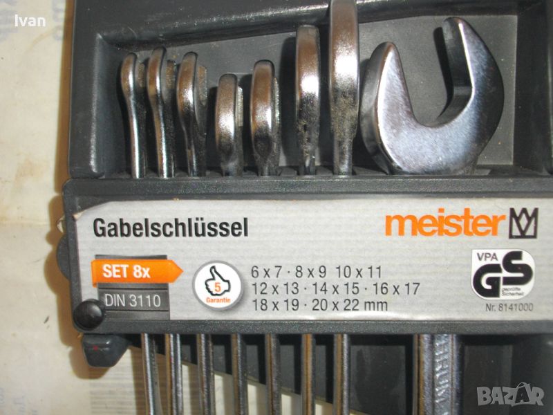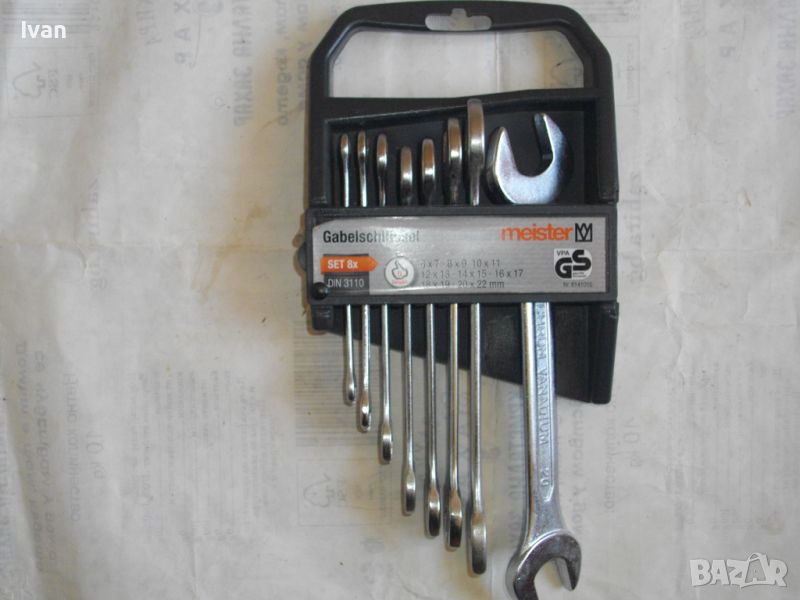 Цена на нов запечатан комплект немски оригинален гаечни ключове - 8 бр - размери от 6 мм до 22 мм - MEISTER - в кутия вложка държач с окачване за стена - цена 79 лв.