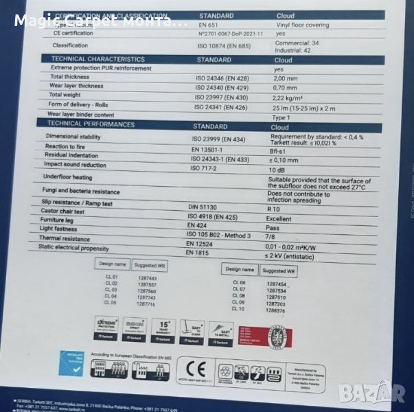 Skyline е колекция от хетерогенни винилови настилки, подходящи за търговски пространства. Благодарение на екстремната защитна обработка на повърхността и 0,7 мм износващ слой, Cloud има отлична устойчивост на абразия и надраскване и е лесен за поддръжка. Избраните цветове на един абстрактен дизайн и технологията без фталати го правят идеално решение за използване в образованието, здравеопазването, магазини, офиси и домашна употреба. 15-годишната гаранция на Tarkett гарантира дълъг жизнен цикъл и високо качество на вашата подова настилка.